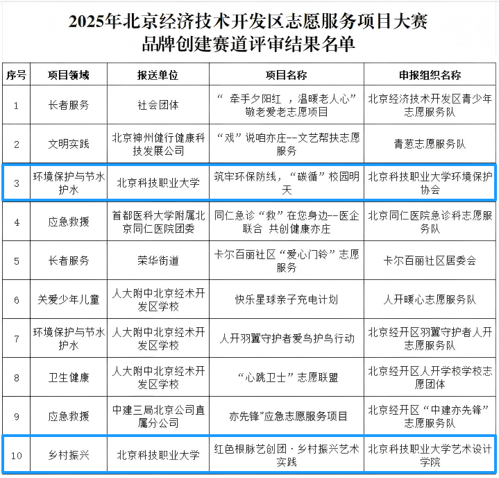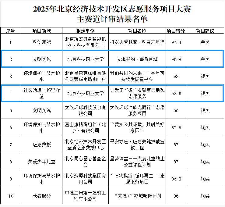 在2025年北京经济技术开发区志愿服务项目大赛中,我校凭借扎实的实践基础和高质量的项目设计,从众多参赛单位中脱颖而出,取得优异成绩。全校10个参赛项目中8个获奖,共斩获主赛道金奖1项、银奖1项,品牌创建赛道入围项目2项,另有5个项目获得提名与创新奖。