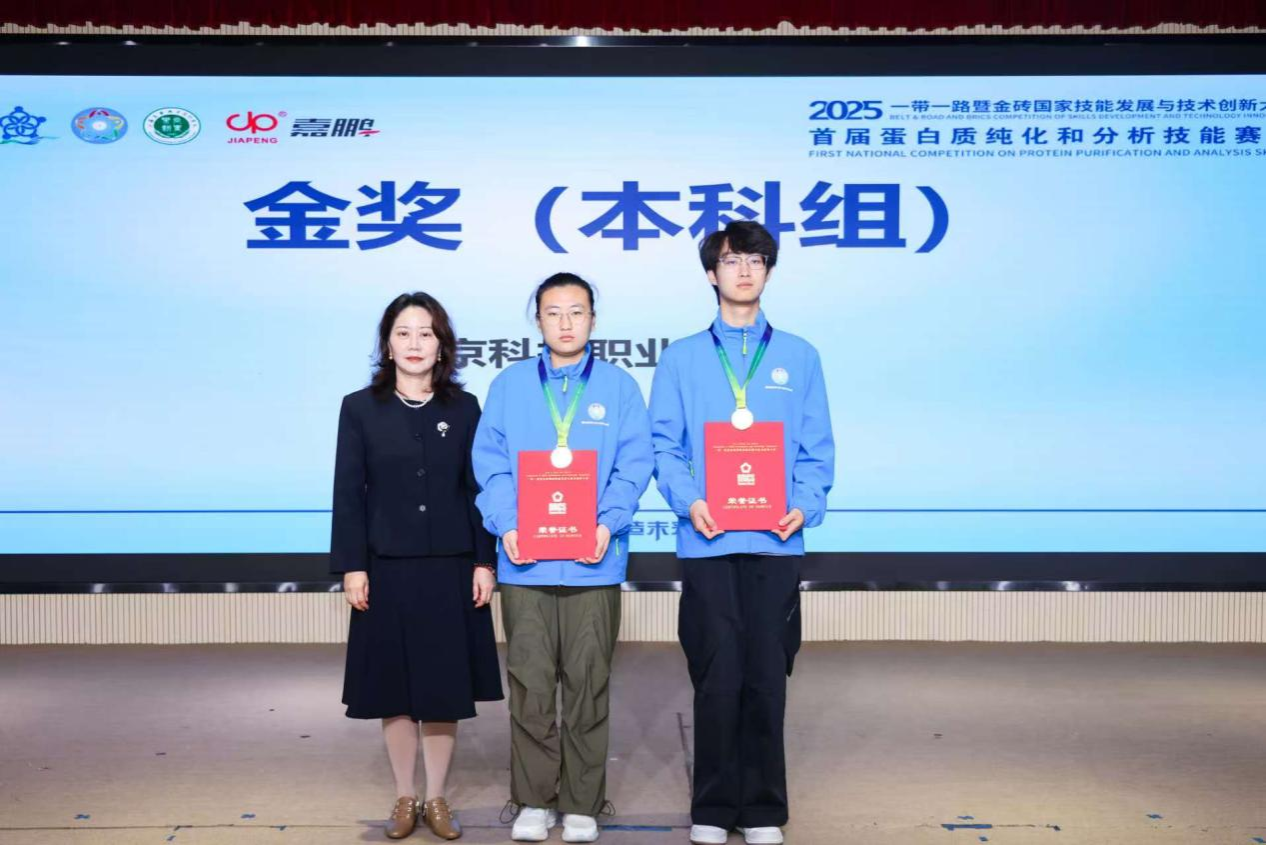 2025年深秋,在上海黄浦江畔,“一带一路”暨金砖国家技能发展与技术创新大赛正在如火如荼地进行着,“获得蛋白质纯化和分析技能赛项本科组金奖的是,北京科技职业大学!”随着主持人宣布出比赛结果,我校参赛队员生物工程学院首届本科生刘铎和赵婧楠激动得相互拥抱。