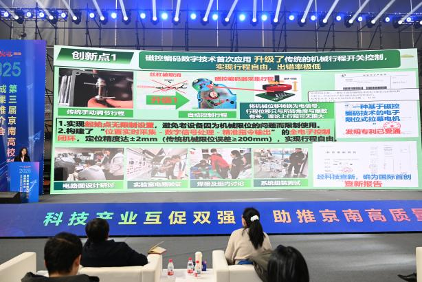 创新成果推介环节,“工业机器人在线校准系统”“农药残留检测样品制备机”“小巨人-智能陪护机器人开端”等25项实物展出反响强烈,吸引了一些企业、投融资机构、相关专业教师面对面交流,促进产学研用深度融合发展。