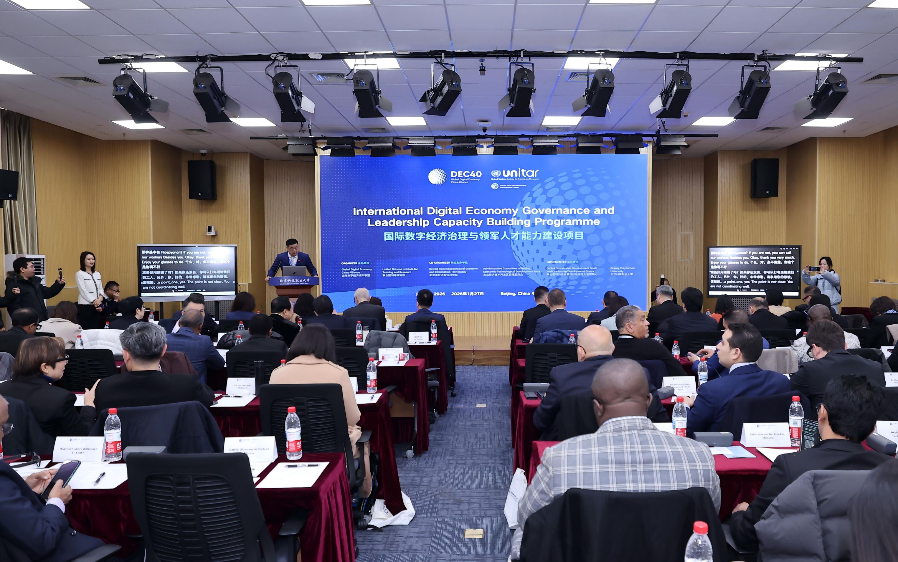 为积极响应全球数字治理体系变革需求,服务“数字中国”建设与全球发展倡议,1月27日上午,由联合国训练研究所(UNITAR)、全球数字经济城市联盟(DEC40)、北京市经济和信息化局、北京经济技术开发区联合主办,联合国可持续发展目标与领导力发展中心和我校共同承办的“国际数字经济治理与领军人才能力建设项目”开班仪式在继续教育学院报告厅举行。市经信局副局长刘维亮、经开区管委会副主任历彦涛、UNITAR多边外交司司长Rabih EL-HADDAD、DEC40主席Francis Gurry,我校校长王伟、副校长辛秀兰及继续教育学院负责人等出席活动,来自东南亚、中亚、非洲等“一带一路”沿线国家的政府高级官员、城市治理专家、企业高管共同参加了开班仪式。