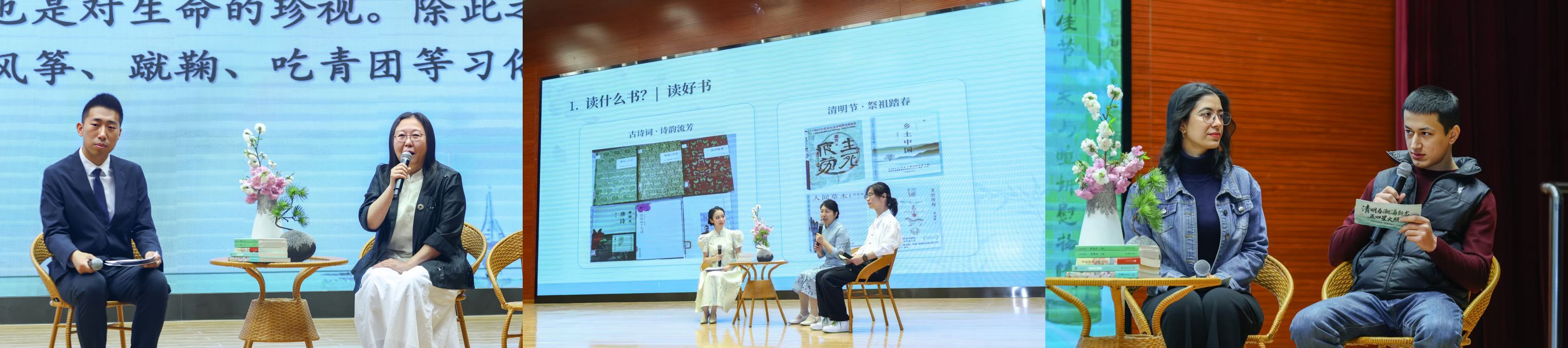 比赛间隙,吴钩人文实践社李春竹老师围绕清明文化展开分享。图书馆胡文丽老师与读者协会会长刘逸扬同学一同分享了读书方法与心得。留学生代表也登台现场吟诵了《清明》诗句,并与全场观众齐声吟诵“少壮不努力,老大徒伤悲”“海上生明月,天涯共此时”的经典诗句,表达了未来希望投身中外文化交流的美好愿望。