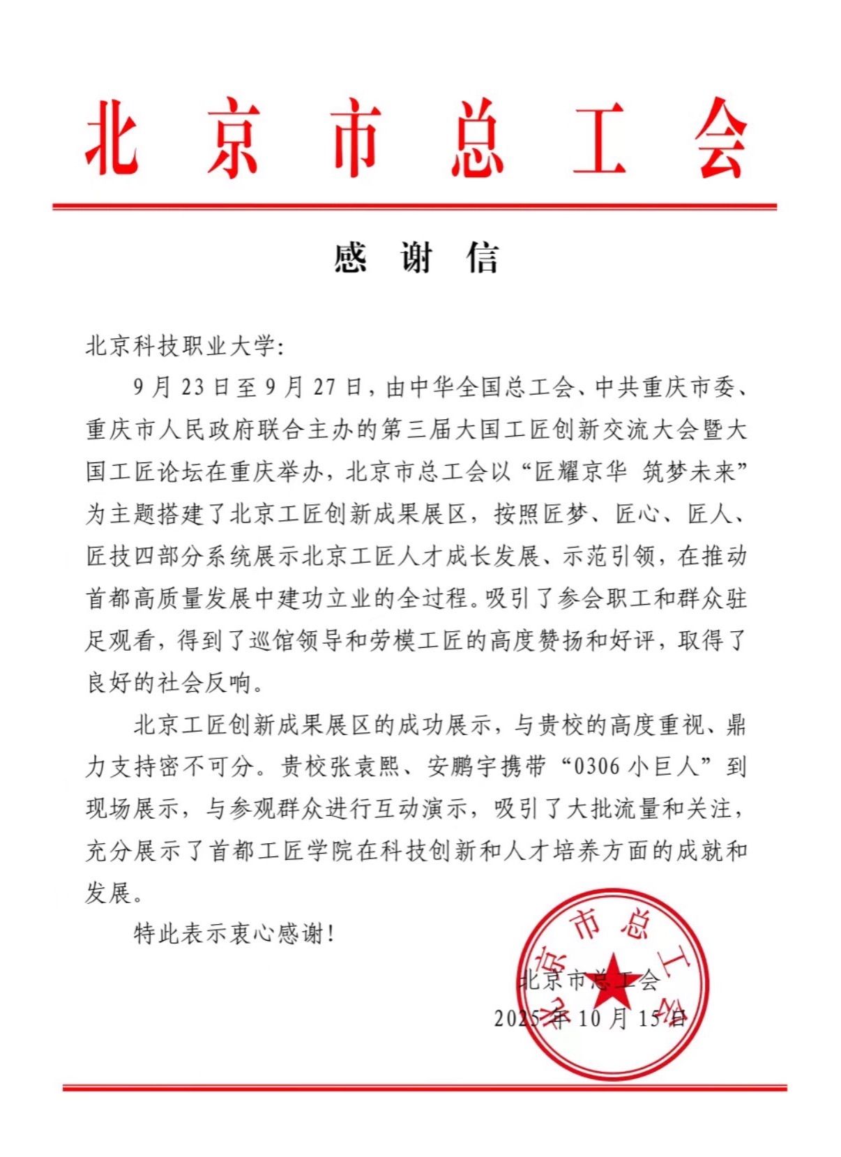 10月15日,北京市总工会向学校发来感谢信,信中对我校工匠学院建设成果在中华全国总工会第三届大国工匠创新交流大会北京市总工会展区进行展示表示感谢。