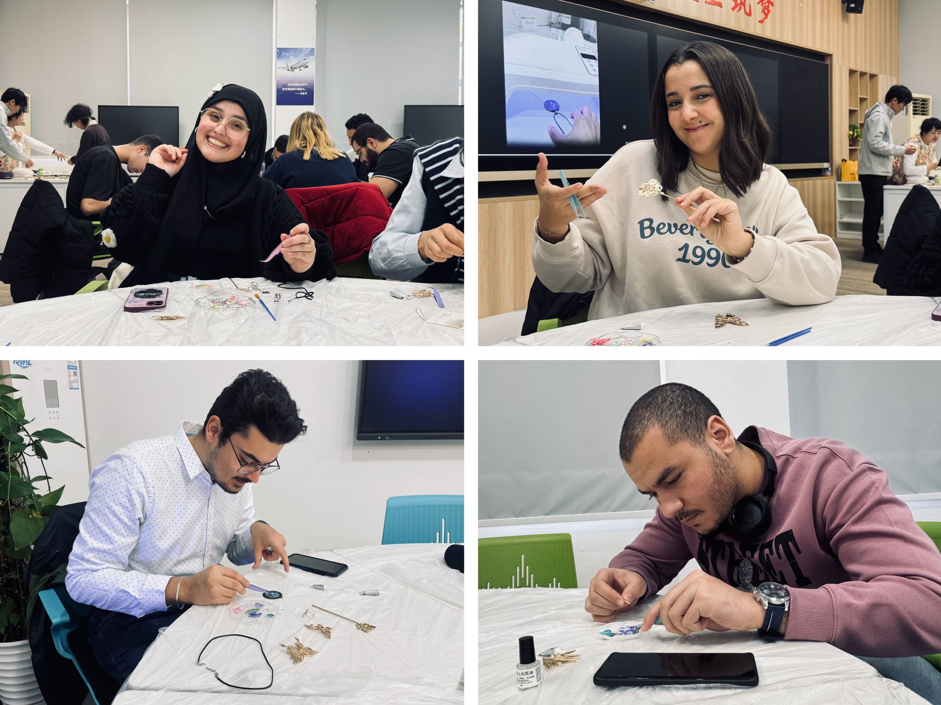 动手实践是本次活动的核心环节。留学生在教师指导下亲手制作螺钿胸针,从设计图案、挑选用材、UV封层,每一步都需专注与耐心。指尖流转的不仅是工艺技巧,更是对“一丝一嵌见匠心”精神的体悟与传承。