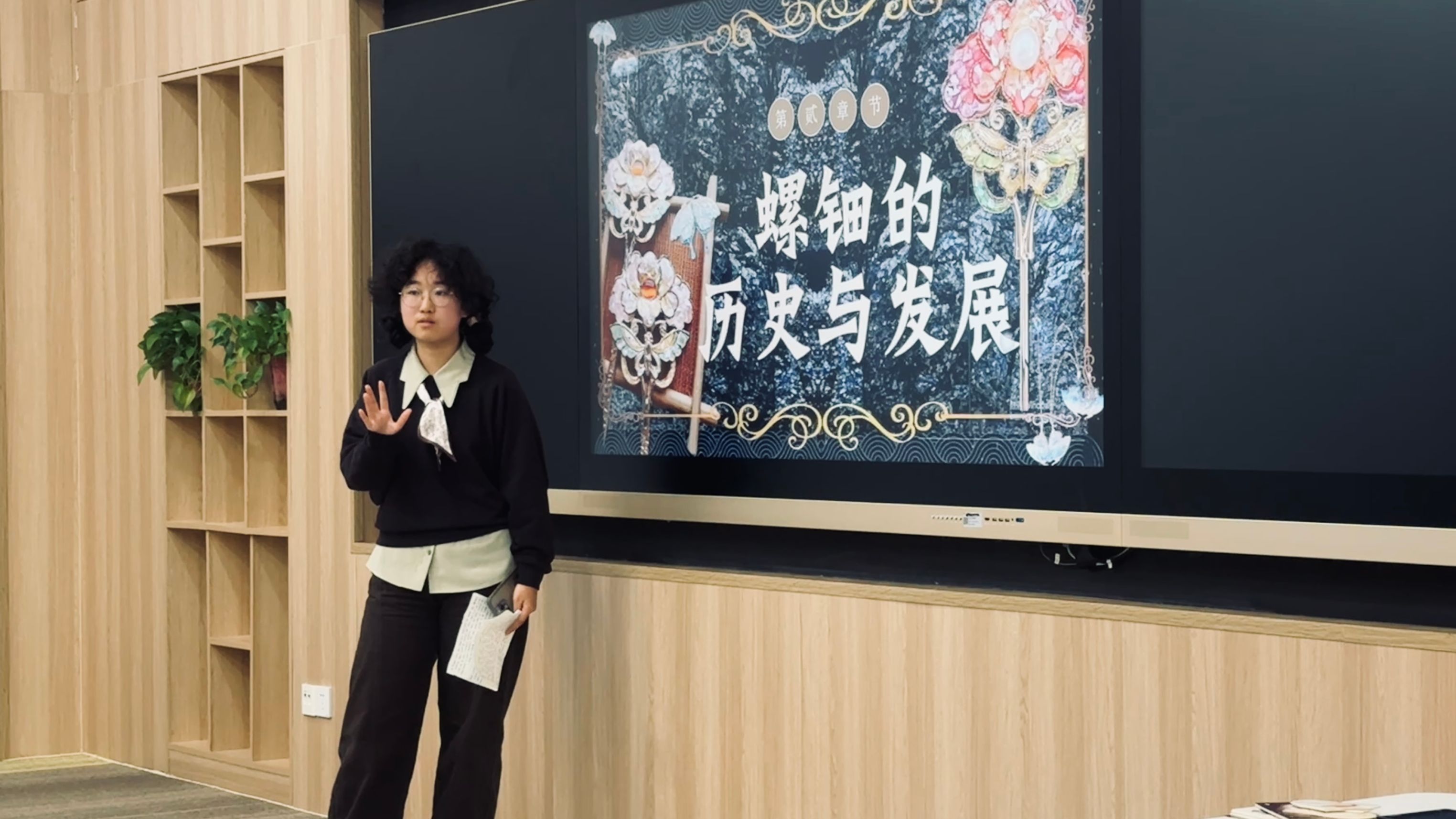 螺钿是中国传统贝壳薄片镶嵌工艺,以珍珠贝、夜光螺、鲍鱼贝等为原料,镶嵌于漆器或木器表面,制成纹样随光流转、绚丽耐久的艺术作品。来自生物工程学院2314贯通药品2班的梅蕊含同学作为主持人为留学生系统梳理了螺钿自商周起源,历经唐宋发展、宋元雅化、明清鼎盛的历史脉络,展现螺钿从宫廷御用到现代文创的演变历程。