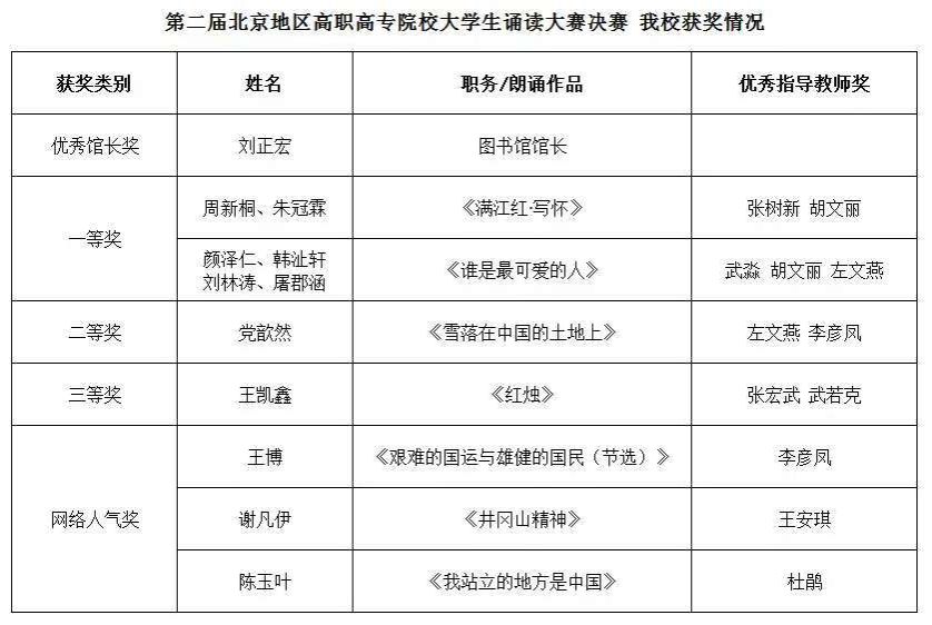 图书馆通过举办诵读大赛校级选拔赛并带队参加市级决赛,为学生搭建了展示才华的舞台,有效提升了学生的人文素养,丰富了校园文化生活,同时进一步增强了我校在北京地区高职高专院校中的知名度与影响力,为区域精神文明的建设与发展贡献了积极力量。