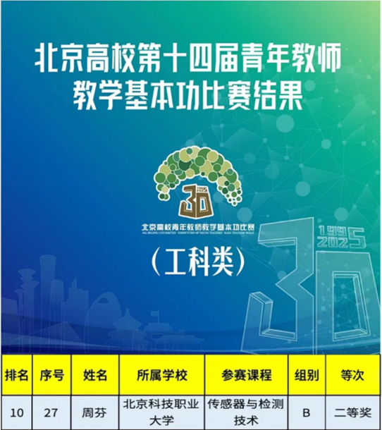 近日,北京高校第十四届青年教师教学基本功比赛结果揭晓。我院青年教师周芬凭借扎实的专业功底、精妙的教学设计与出色的现场发挥,在激烈竞争中脱颖而出,荣获大赛二等奖,充分展现了学院青年教师卓越的教学风采与育人水平。