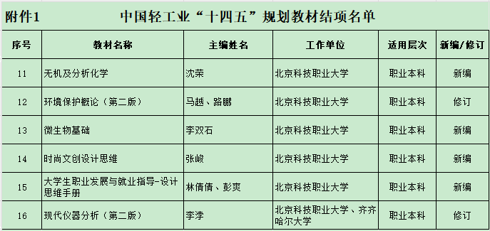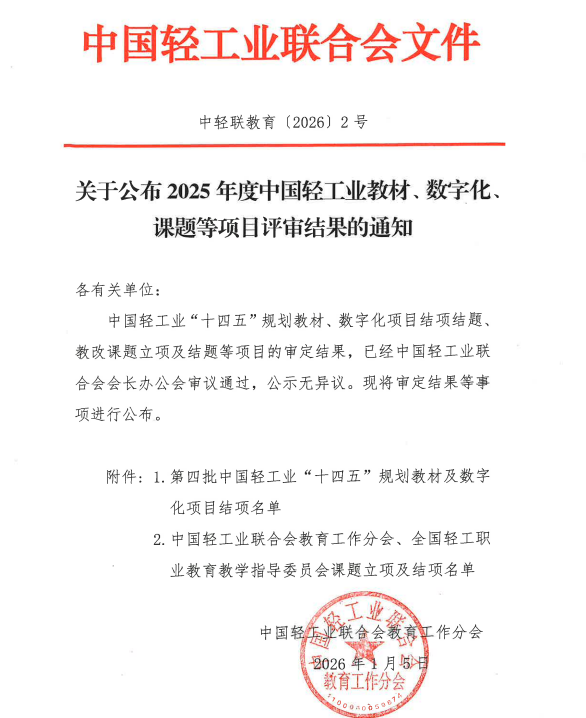 近日,中国轻工业联合会发布《关于公布2025年度中国轻工业教材、数字化、课题等项目评审结果的通知》。经单位申报、资格审查和专家评审等环节,我校共有6部教材成功入选中国轻工业“十四五”规划教材。包括生物工程学院《无机及分析化学》《环境保护概论(第二版)》《微生物基础》《现代仪器分析(第二版)》4部教材,及艺术设计学院《时尚文创设计思维》《大学生职业发展与就业指导-设计思维手册》2部教材。