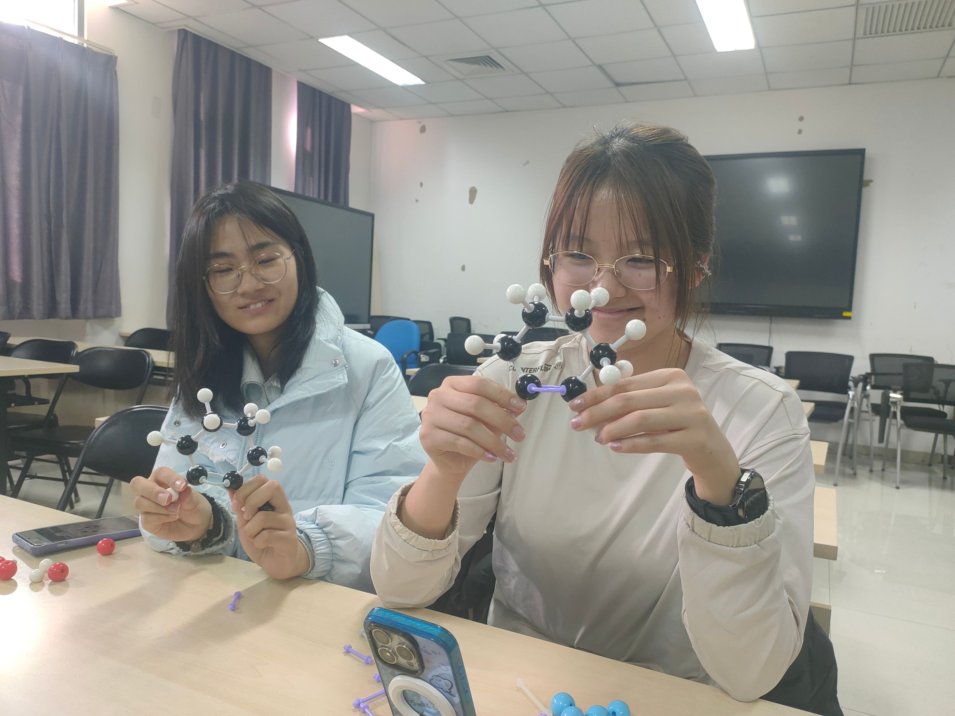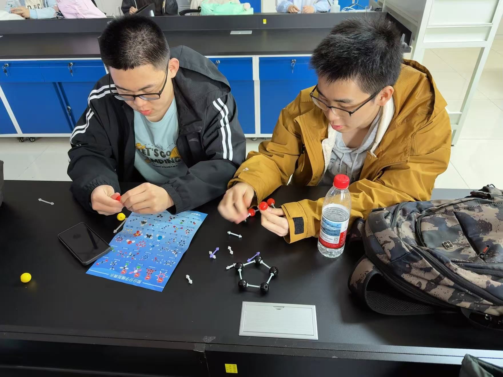 活动共有67名学生积极参与,将动手实践与趣味学习深度融合,让有机化学知识变得具象可感。在自主拼搭学习阶段,学院充分利用学生课余时间,依托一站式服务空间、教室、实验室等场地,组织三个班级有序开展化学分子球棍模型自主拼搭。活动中,同学们以个人或小组为单位,亲手拼接甲烷、苯、乙醇等各类有机化合物的三维球棍模型,在动手操作的过程中,直观感受有机分子的空间结构,有效加深了对化学分子结构的理解与记忆。