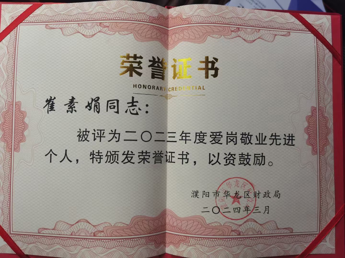 作为税务大厅一线工作人员,她始终坚守“始于纳税人需求,终于纳税人满意”的服务理念,以耐心、细心、责任心对待每一项业务、每一位办税群众,在平凡的岗位上践行初心使命,用专业服务诠释税务担当。她连续多年获评单位“年度服务之星”。在税务金三系统并库时接待领导并为领导演示和讲解,她还积极参与单位各项活动,在华龙区税务局“书香卫税”读书心得征文比赛中荣获一等奖。