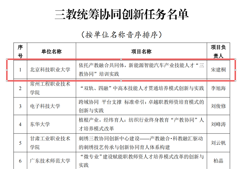 1月19日,教育部职业教育与成人教育司公布第三批高等继续教育领域学习型社会建设重点任务名单,我校汽车工程学院“依托产教融合共同体,新能源智能汽车产业技能人才‘三教协同’培训实践”项目入选三教统筹协同创新任务名单,继续教育学院“产业工人职业技能培训赋能学习型社会建设的探索与实践”项目入选非学历教育改革创新任务名单。