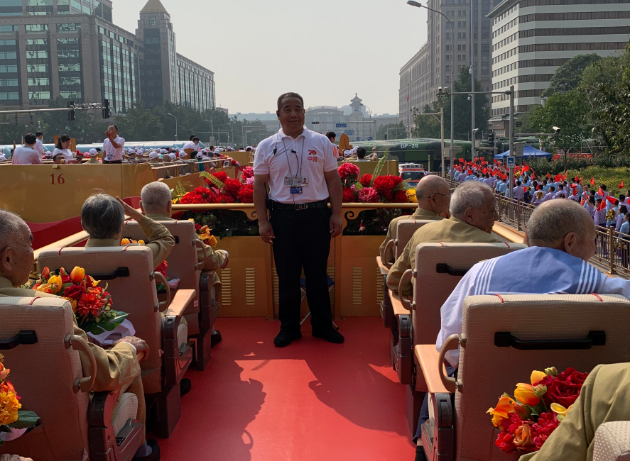 一曲《红旗颂》奏响,21辆庄重美观的礼宾车徐徐驶来,由平均年龄80岁的开国元勋亲属、英烈子女、老兵们所组成的“致敬”方阵经过天安门广场的时候,无数人为之动容。那一刻,张建柱带着400名志愿服务学生在花车下的空间全身戒备,期盼车辆安全平稳驶过天安门,期盼他创造性提出的“推车”要领无用武之地。