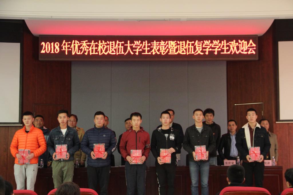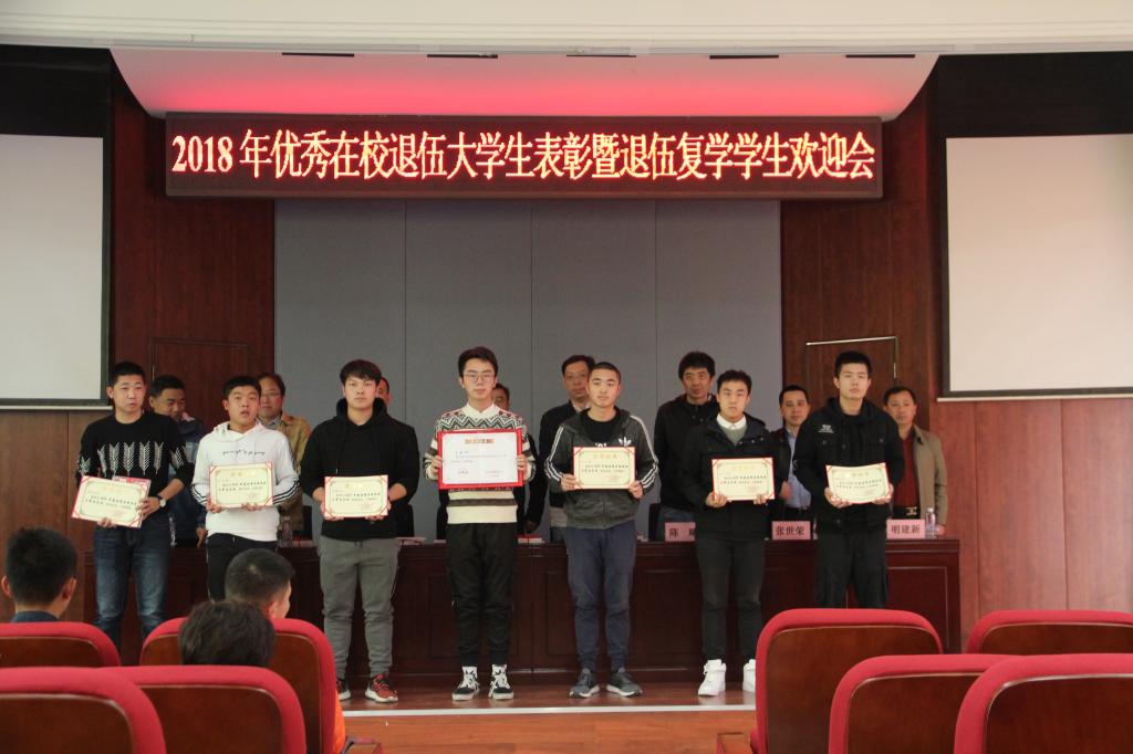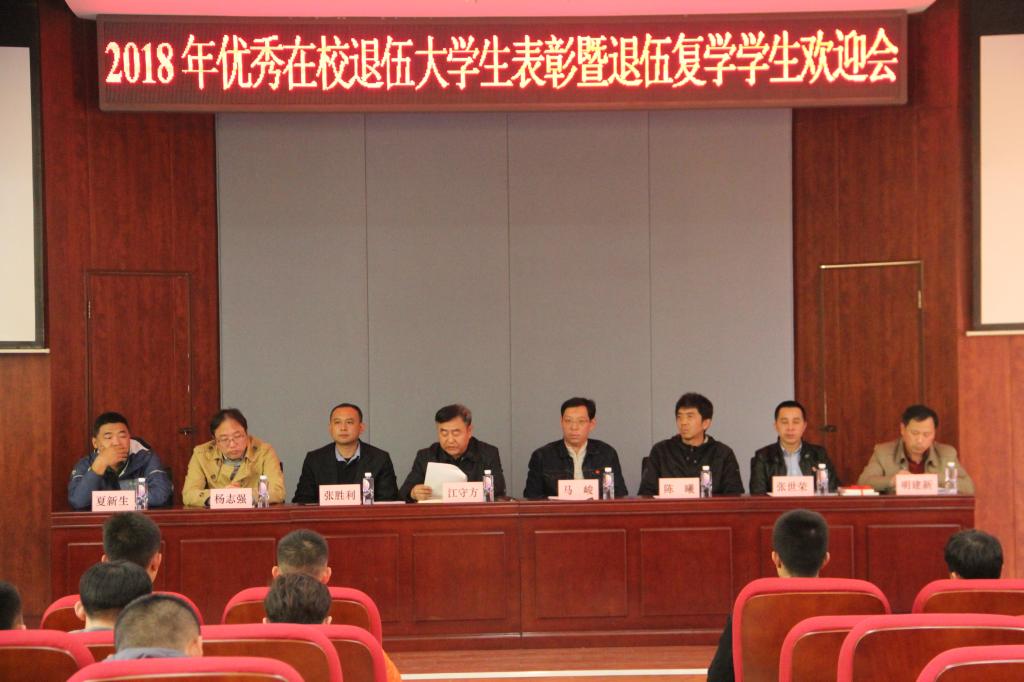 10月31日下午,我校2018年优秀在校退伍大学生士兵表彰暨退伍复学学生欢迎会在艺术设计学院报告厅举行。党委武装部和各二级学院党总支副书记、负责征兵工作的辅导员、全体退伍复学学生和部分在校退伍学生100余人参加了大会。