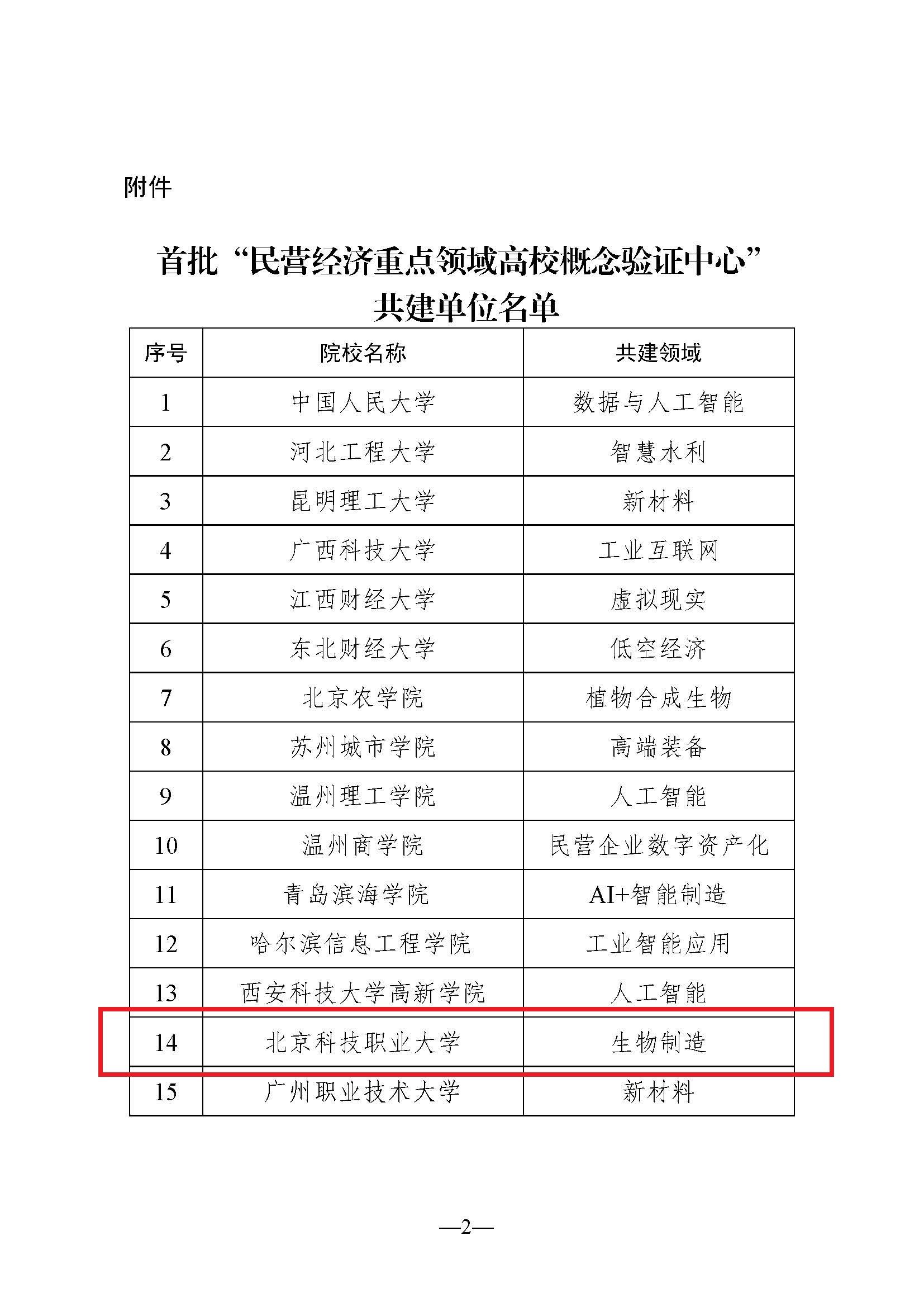 2025年9月9日,经联合申报、专家组线上线下考察、申报材料评议等严格评审,由北京科技职业大学牵头申报的“民营经济生物制造高校概念验证中心”项目正式获批。这一荣誉不仅标志着学校在生物制造领域的科研实力获得国家认可,更为推动产学研深度融合、服务民营经济发展提供了重要平台。