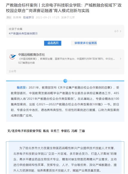 9月,专委会优中选优,遴选具有典型性、引领性的案例进行展播。我校作为产教融合标杆案例被中国教育发展战略学会产教融合专业委员会、《中国远程教育》杂志社等官方微信展播转发,以助力典型案例成果的推广应用。