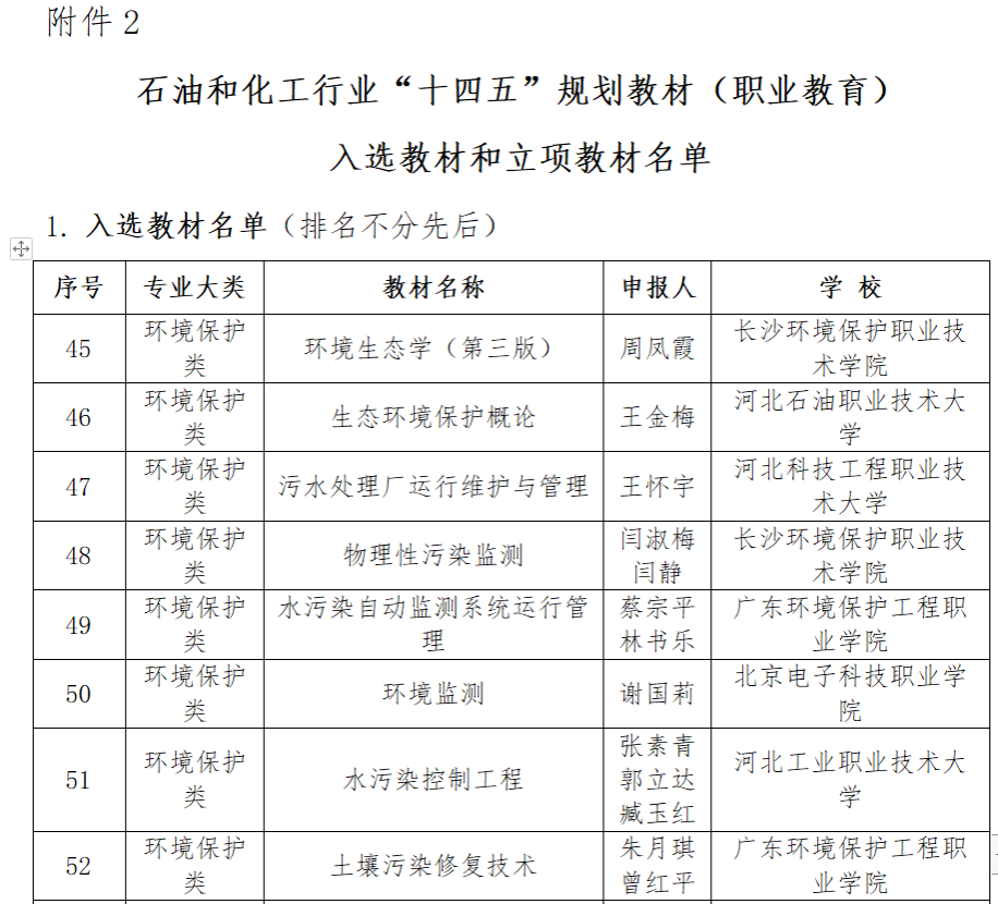 2024年12月12日中国化工教育协会发布了《关于石油和化工行业“十四五”规划教材(职教本科第一批)、石油和化工行业“十四五”规划教材(职业教育)入选教材和立项教材的通知》,经过严格的申报、资格审查和专家评审,我校生物工程学院环境技术系谢国莉老师主编的《环境监测》教材成功入选石油和化工行业“十四五”规划教材,该教材以当前最新的环境标准和技术规范为依据,以环境监测的基础知识和基本技术为主线,在环境监测内容中融入行业和企业新技术、新方法、新标准。此次入选是对该教材编写质量的高度认可,也体现了学院在三教改革与五金建设方面取得的显著成果。