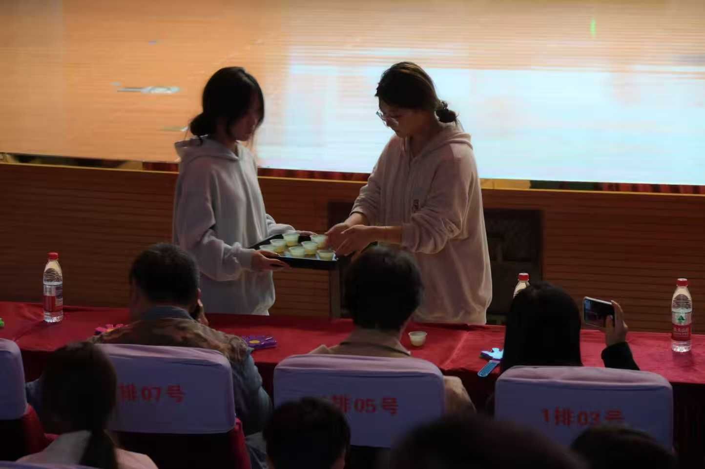 “茶已沏好,七分满,三分情。”吴佩玲轻声道出邀约。话音落下,邵茉雅、张筱妤与三位礼仪志愿者轻步上台,手捧茶盏,恭敬奉予席间师长。一杯敬教诲,一杯奉温情,传统礼仪在青春的手中,被重新赋予温度。