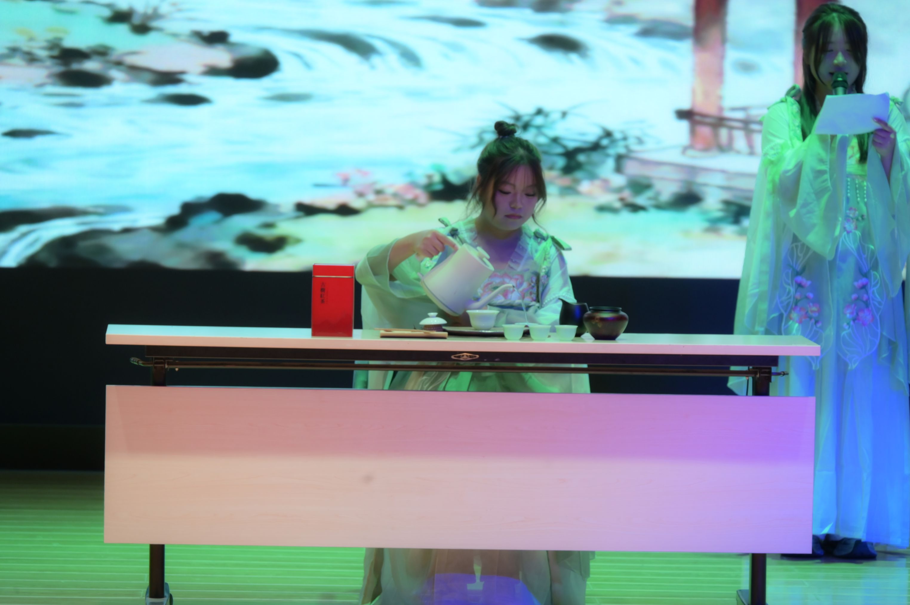 乐声流转,《溪行桃花源》如清泉漫过舞台。张娴静与吴佩玲一着汉服,宛若从古典画卷中走来。一人端坐沏茶,举止如云如水——温杯、注汤、出茶,古树红茶在她手中苏醒,香气如雾,袅袅升腾;另一人婷婷立于侧,语声清柔,将“凤凰三点头”“茶斟七分满”中的礼与意,娓娓道来。那一刻,茶不再只是茶,而是穿越时光的温柔低语。