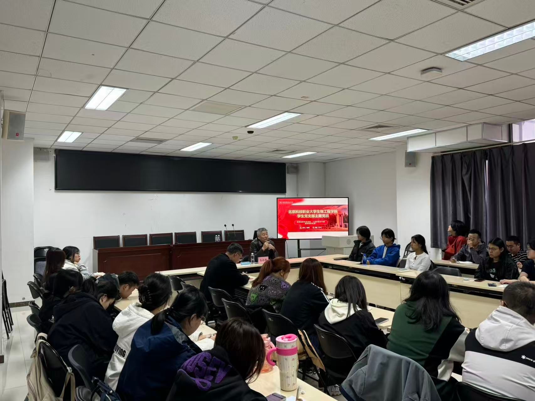 整场讲座氛围严肃、认真,马老师以其一贯的严谨作风,阐述了学生党员先锋模范作用的深刻内涵与实践路径。他没有空谈理论,而是将宏大的命题落到了学生日常学习与生活的细微处。在学习上,他明确指出,学生党员必须是学风建设的排头兵,不仅要自身成绩过硬,更要主动带动身边同学共同进步,营造“比、学、赶、帮、超”的积极氛围。在宿舍生活中,他强调党员应成为文明和谐的引领者,在维护宿舍卫生、协调人际关系、遵守校规校纪方面以身作则,将宿舍打造成思想政治教育的微观阵地。在技能比赛与创新实践中,他鼓励大家要敢于挑战、走在前列,将专业所学转化为实践能力,在各类竞赛和科研项目中展现生物学子的卓越风采,服务国家科技发展战略。