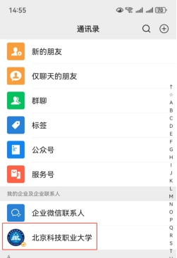 1、进入“北京科技职业大学”企业微信号(图1),找到“校园卡服务”(图2)。