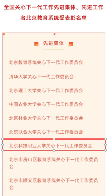 近日,纪念中国关工委成立35周年暨全国关心下一代工作表彰大会在北京召开,北京科技职业大学关工委再次荣获“全国关心下一代工作先进集体”荣誉称号。